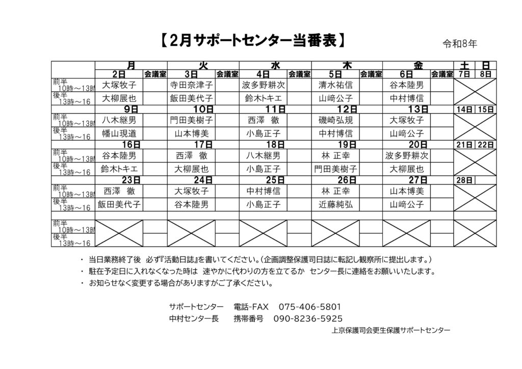 保護中: 令和8年2月更生保護サポートセンター当番表